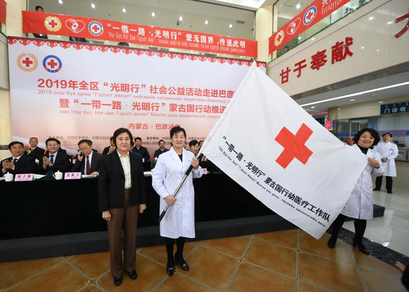 4月20日,自治区党委副书记、自治区主席、自治区红十字会名誉会长布小林向“一带一路·光明行”蒙古国行动医疗队和2019年全区“光明行”社会公益活动医疗队授旗。内蒙古日报社融媒体记者韩卿立摄