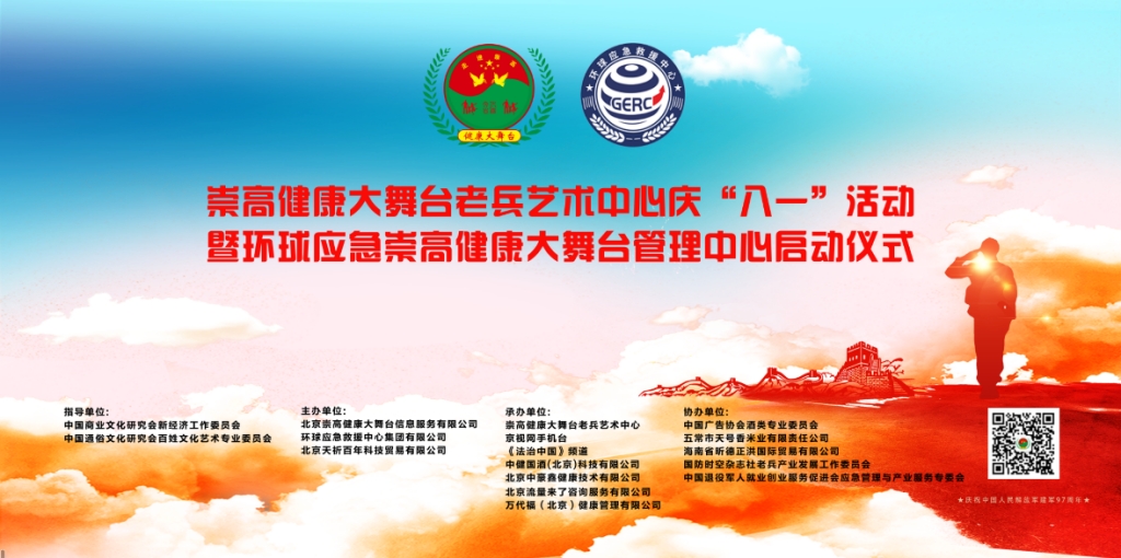 为庆祝中国人民解放军建军97周年,向“最可爱的人”致以最崇高的敬意,8月1日,由北京崇高健康大舞台信息服务有限公司、环球应急救援中心集团有限公司主办,崇高健康大舞台老兵艺术中心、京视网手机台、《法治中国》频道、中健国酒(北京)科技有限公司、万代福(北京)健康管理有限公司、北京流量来了咨询服务有限公司承办的崇高健康大舞台老兵艺术团庆祝八一建军节活动暨环球应急崇高健康大舞台管理中心启动仪式在京隆重举行。